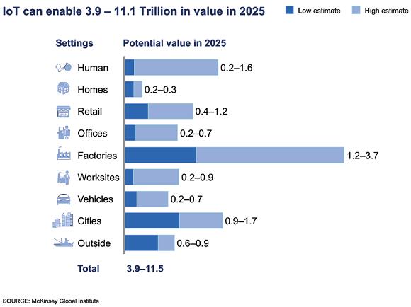 All this indicates in one direction – the potential for the Internet of Things. According to McKinsey Global Institute, from the human body to our homes, offices, vehicles, shops, factories, and cities, the Internet of Things has the potential to generate US$ 3.9 to 11.1 Trillion in value in 2025