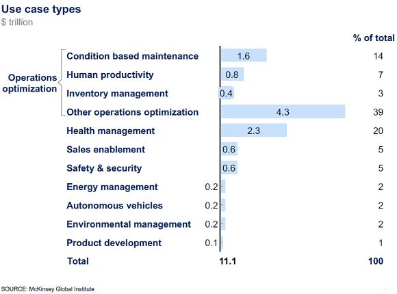 Having said that, most of the data generated by the Internet of Things is not used. According to McKinsey, currently such data is used for real-time control and anomaly detection while there remains a huge usage scope of such data in decision making processes: prediction and optimisation. In terms of scope, there appears to be a higher value potential in B2B than in the B2C sector and while more value is likely to be generated in developed markets, the volumes generated in emerging markets will be much higher. The following are the use case types according to the McKinsey Global Institute:
